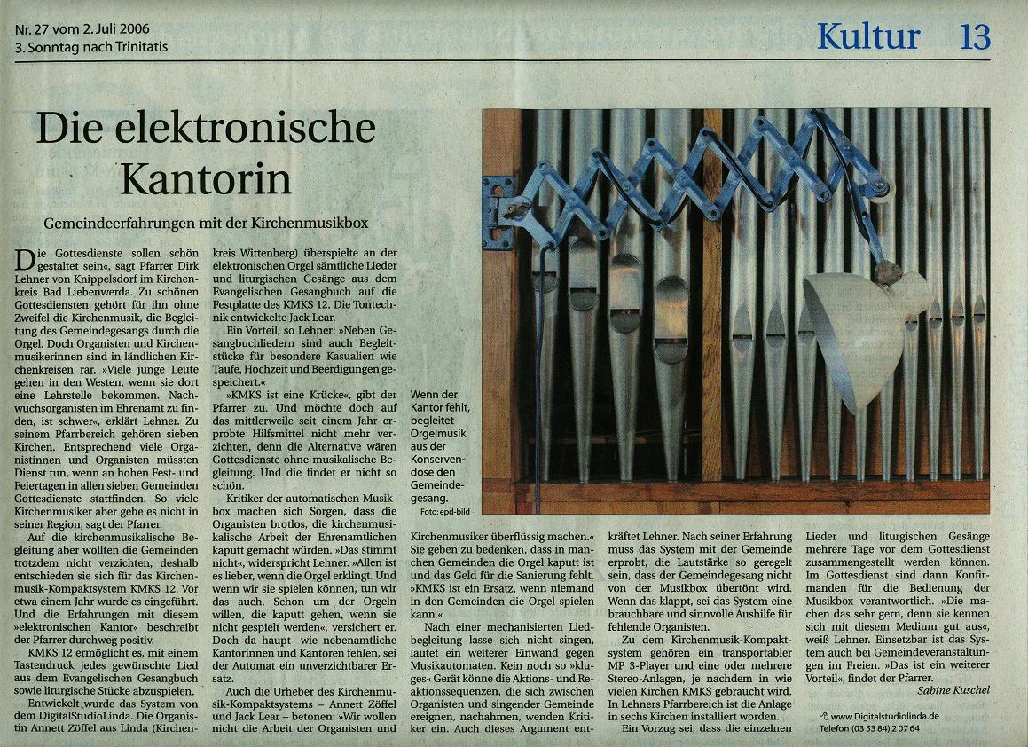 Entwickelt wurde das System von dem DigitalStudioLinda. Die Organistin Annett Zöffel aus Linda (Kirchenkreis Wittenberg) überspielte an der elektronischen Orgel sämtliche Lieder und liturgischen Gesänge aus dem Evangelischen Gesangbuch auf die Festplatte des KMKS 12. Die Tontechnik entwickelte Jack Lear. Ein Vorteil, so Lehner: »Neben Gesangbuchliedern sind auch Begleitstücke für besondere Kasualien wie Taufe, Hochzeit und Beerdigungen gespeichert.«