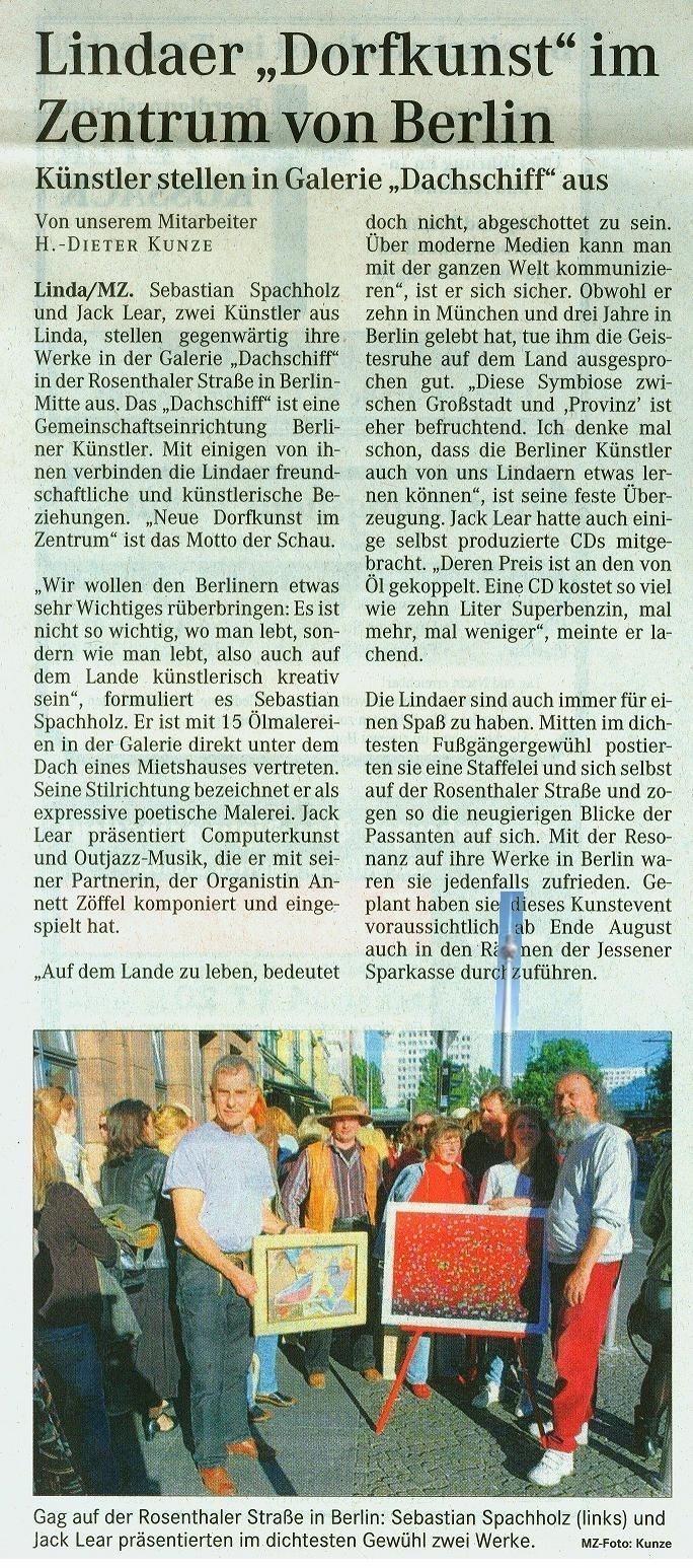 "Wir wollen den Berlinern etwas sehr Wichtiges rüberbringen: Es ist nicht so wichtig, wo man lebt, sondern wie man lebt, also auch auf dem Lande künstlerisch kreativ sein", formuliert es Sebastian Spachholz. Er ist mit 15 Ölmalereien in der Galerie direkt unter dem Dach eines Mietshauses vertreten. Seine Stilrichtung bezeichnet er als expressive poetische Malerei. Jack Lear präsentiert Computerkunst und Outjazz-Musik, die er mit seiner Partnerin, der Organistin Annett Zöffel komponiert und eingespielt hat.