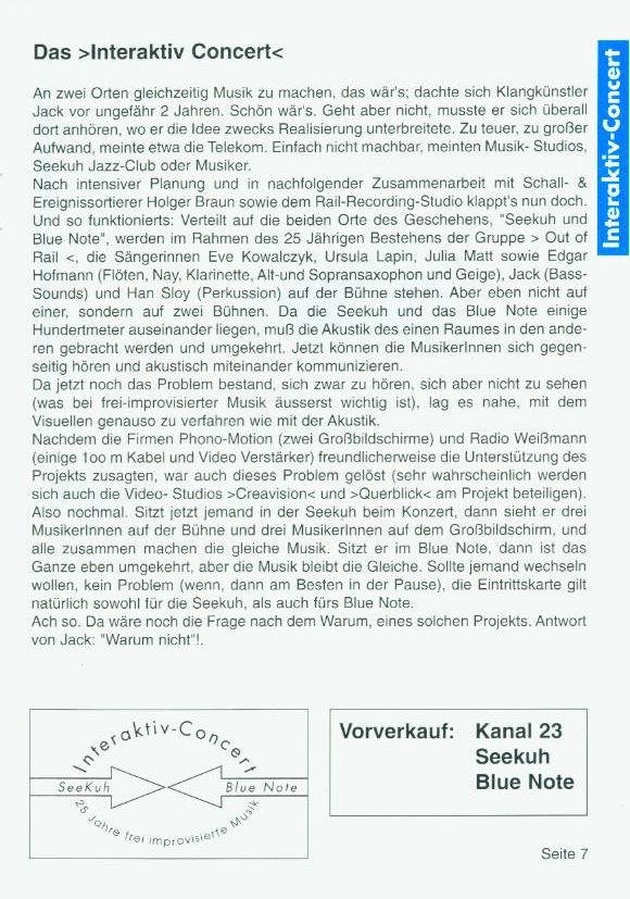Puscha Elisabeth Fröhlich, Jack Lear, Peter Haupeltshofer, Robert Brühl, Gerold Haitbaum, Günther Weiss, Stefan Gansewig, Heiner Merk, Robert Rüegg, Andy Merk, Jürgen Waidele, Der Erfinder des Namens " RAIL " ist übrigens JACK LEAR [Jack] - Einfach RAIL und LEAR rückwärts aussprechen und schon klingelt´s ... ! Edgar Hofmann, EMBRYO, Michael Ausserbauer, Uli Trepte, GURU GURU, Ernst Seibt, 1. Cherisy-Fest, Joe Rodius, Klaus Lage Band Medienberichte 1 vom Interaktiv-Concert Medienberichte 2 vom Interaktiv-Concert Bilder vom Interaktiv-Concert Werner Lüdi, Mani Neumeier, Franz Monschau, HALLO JA GUT DANKE, Peter Kowalt, Dorothea Schürch, Julia Matt, Roland Dostal, Kanal 23, Ekkehard Creutzburg, Solar-Performance Bernd Konrad, Tour de Konstanz, Kreativitätstriorie, Space Box, Veeser Jack Sloy JERG, Misol GmbH Reinhard Daum, Prof. Bernd Konrad, Jürgen Waidele, Kurt Schreiner, Halleluja Ramblers, Dr. Harro Eden, Inge Mißmahl, Sebastian Studnitzky, Paul Schwarz, Günther "Baby" Sommer |