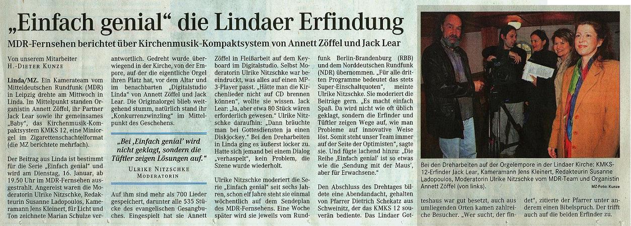 Der Beitrag aus Linda ist bestimmt für die Serie "Einfach genial" und wird am Dienstag, 16. Januar, ab 19.50 Uhr im MDR-Fernsehen ausgestrahlt. Angereist waren die Moderatorin Ulrike Nitzschke, Redakteurin Susanne Ladopoulos, Kameramann Jens Kleinert, für Licht und Ton zeichnete Marian Schulze verantwortlich. Gedreht wurde überwiegend in der Kirche, von der Empore, auf der die Kammerorgel ihren Platz hat, vor dem Altar und im benachbarten "DigitalStudioLinda" von Annett Zöffel und Jack Lear. Die Kammerorgel blieb weitgehend stumm, natürlich stand ihr "Konkurrenzwinzling" im Mittelpunkt des Geschehens.