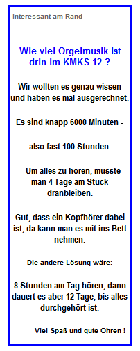 Weitere Lieder sowie Orgelmusik zum Eingang und Ausgang im Gottesdienst können Sie auf dieser Seite unserer Homepage anhören: Musikbeispiele aus dem KMKS 12